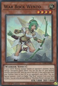 Description: If your EARTH Warrior monster battles an opponent's monster, during damage calculation (Quick Effect): You can pay 800 LP; your battling monster gains 800 ATK, until the end of this turn. If this card is sent from your Monster Zone to your GY by an opponent's card effect: You can Special Summon 1 Level 5 or higher "War Rock" monster from your hand or Deck. You can only use each effect of "War Rock Wento" once per turn.
