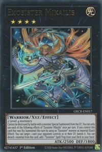 Cannot be destroyed by battle with a monster Special Summoned from the GY. You can only use each of the following effects of "Exosister Mikailis" once per turn. If you control this card that was Xyz Summoned this turn by using an "Exosister" monster as material (Quick Effect): You can target 1 card your opponent controls or in their GY; banish it. You can detach 1 material from this card; add 1 "Exosister" Spell/Trap from your Deck to your hand.