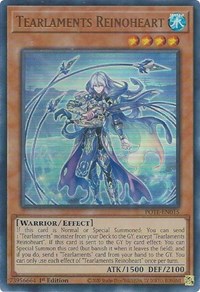 Description: If this card is Normal or Special Summoned: You can send 1 "Tearlaments" monster from your Deck to the GY, except "Tearlaments Reinoheart". If this card is sent to the GY by card effect: You can Special Summon this card (but banish it when it leaves the field), and if you do, send 1 "Tearlaments" card from your hand to the GY. You can only use each effect of "Tearlaments Reinoheart" once per turn.