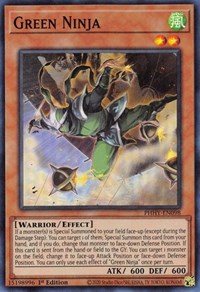 Description: If a monster(s) is Special Summoned to your field face-up (except during the Damage Step): You can target 1 of them; Special Summon this card from your hand, and if you do, change that monster to face-down Defense Position. If this card is sent from the hand or field to the GY: You can target 1 monster on the field; change it to face-up Attack Position or face-down Defense Position. You can only use each effect of "Green Ninja" once per turn.