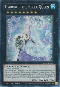 You can detach 1 material from this card, then target 1 monster on the field; Tribute it. This is a Quick Effect if this card has a Plant monster as material. You can only use this effect of "Teardrop the Rikka Queen" once per turn. Each time a monster(s) is Tributed: This card gains 200 ATK for each, until the end of this turn.