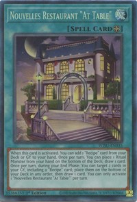 Description: When this card is activated: You can add 1 "Recipe" card from your Deck or GY to your hand. Once per turn: You can place 1 Ritual Monster from your hand on the bottom of the Deck; draw 1 card. Once per turn, during your End Phase: You can target 2 cards in your GY, including a "Recipe" card; place them on the bottom of your Deck in any order, then draw 1 card. You can only activate 1 "Nouvelles Restaurant "At Table"" per turn.