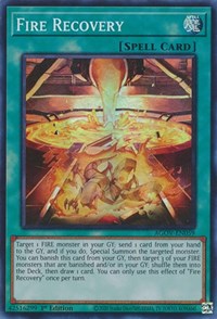 Description: Target 1 FIRE monster in your GY; send 1 card from your hand to the GY, and if you do, Special Summon the targeted monster. You can banish this card from your GY, then target 3 of your FIRE monsters that are banished and/or in your GY; shuffle them into the Deck, then draw 1 card. You can only use this effect of "Fire Recovery" once per turn.