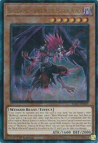 Description: If you control no monsters and have this card in your hand: You can banish 1 other "Blackwing" monster from your hand; place 1 "Black Whirlwind" from your deck face-up in your Spell & Trap Zone, then, either send this card to the GY, or immediately after this effect resolves, Normal Summon it without Tributing. You cannot Special Summon monsters from the Extra Deck for the rest of this turn, except DARK monsters. You can only use this effect of "Blackwing - Simoon the Poison Wind" once per turn. During the End Phase, send the "Black Whirlwind" placed by this effect to the GY, and if you do, take 1000 damage.