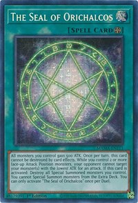 Description: All monsters you control gain 500 ATK. Once per turn, this card cannot be destroyed by card effects. While you control 2 or more face-up Attack Position monsters, your opponent cannot target your monster(s) with the lowest ATK for an attack. If this card is activated: Destroy all Special Summoned monsters you control. You cannot Special Summon monsters from the Extra Deck. You can only activate "The Seal of Orichalcos" once per Duel.