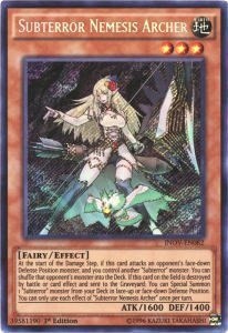 Description: At the start of the Damage Step, if this card attacks an opponent''s face-down Defense Position monster, and you control another "Subterror" monster: You can shuffle that opponent''s monster into the Deck. If this card on the field is destroyed by battle or card effect and sent to the Graveyard: You can Special Summon 1 "Subterror" monster from your Deck in face-up or face-down Defense Position. You can only use each effect of "Subterror Nemesis Archer" once per turn.