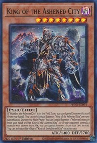 Description: If "Obsidim, the Ashened City" is in the Field Zone, you can Special Summon this card (from your hand). You can only Special Summon "King of the Ashened City" once per turn this way. During your Main Phase: You can Special Summon 1 "Ashened" monster from your hand, except "King of the Ashened City", or if your opponent controls a monster with 2800 or more ATK, you can Special Summon it from your Deck instead. You can only use this effect of "King of the Ashened City" once per turn.
