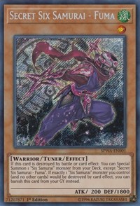 Description: If this card is destroyed by battle or card effect: You can Special Summon 1 "Six Samurai" monster from your Deck, except "Secret Six Samurai - Fuma". If exactly 1 "Six Samurai" monster you control (and no other cards) would be destroyed by card effect, you can banish this card from your GY instead.