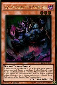 Description: If you control a monster that is not a "Burning Abyss" monster, destroy this card. Cannot be used as a Synchro Material, except for the Synchro Summon of a "Burning Abyss" Synchro Monster. If you control no Spell/Trap Cards: You can Special Summon this card from your hand. You can only use this effect of "Rubic, Malebranche of the Burning Abyss" once per turn.