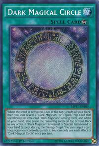 Description: When this card is activated: Look at the top 3 cards of your Deck, then you can reveal 1 "Dark Magician" or 1 Spell/Trap Card that specifically lists the card "Dark Magician", among them, and add it to your hand, also place the remaining cards on top of your Deck in any order. If "Dark Magician" is Normal or Special Summoned to your field (except during the Damage Step): You can target 1 card your opponent controls; banish it. You can only use each effect of "Dark Magical Circle" once per turn.