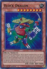Description: Cannot be Normal Summoned/Set. Must be Special Summoned (from your hand or Graveyard) by banishing 3 EARTH monsters from your hand and/or Graveyard, and cannot be Special Summoned by other ways. Rock-Type monsters you control cannot be destroyed, except by battle. If this card is sent from the field to the Graveyard: You can add up to 3 Rock-Type monsters from your Deck to your hand, whose total Levels equal 8. You can only use this effect of "Block Dragon" once per turn.