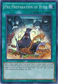 Add 1 Ritual Spell Card from your Deck to your hand, and add 1 Ritual Monster from your Deck or Graveyard to your hand whose name is listed on that Ritual Spell Card. You can only activate 1 "Pre-Preparation of Rites" per turn.