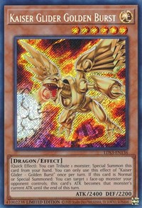 Description: (Quick Effect): You can Tribute 1 monster; Special Summon this card from your hand. You can only use this effect of "Kaiser Glider - Golden Burst" once per turn. If this card is Normal or Special Summoned: You can target 1 face-up monster your opponent controls; this card's ATK becomes that monster's current ATK until the end of this turn.