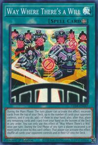Description: During the Main Phase: The turn player can activate this effect; excavate cards from the top of your Deck, up to the number of cards your opponent controls, and if you do, add 1 of them to your hand, also, after that, place any remaining cards and 1 card from your hand on the bottom of the Deck in any order. You can only use this effect of "Way Where There's a Will" once per turn. During the End Phase of any turn a player excavated 9 or more cards at once by this card's effect: That player can activate this effect; shuffle all cards your opponent controls and in their GY into the Deck.