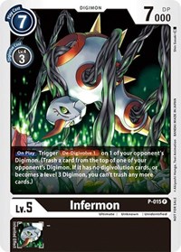 Description: [On Play] Trigger [De-Digivolve 1] on 1 of your opponent's Digimon. (Trash a card from the top of one of your opponent's Digimon. If it has no digivolution cards, or becomes a level 3 Digimon, you can't trash any more cards.)