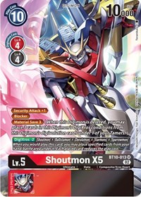 [DigiXros -2] [Shoutmon] x [Ballistamon] x[Dorulumon] x [Starmons] x [Sparrowmon] When you would play this card, you may place specified cards from your hand/battle area under it. Each placed card reduces the play cost.