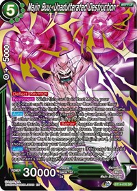 [Auto] When this card is played from your hand, choose all other non-token cards in all Battle Areas and all Unison Cards, ignoring [Barrier], negate their skills, and place them in their owner's Drop Areas. Your opponent chooses 2 cards in their hand and discards them, and if your Leader Card is a mono-green "Majin" card, place those cards under your Leader Card.