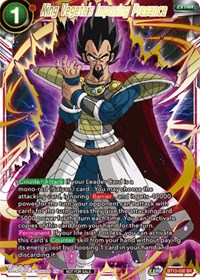 Description: [Counter:Attack] If your Leader Card is a mono-red "Saiyan" card : You may choose the attacking card, ignoring [Barrier], and it gets -10000 power from the turn; your opponent can't attacking card -5000 power for the turn each time. You can't activate copies of this card from your hand for the turn.