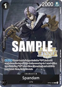 [On Play] If your Leader's type includes "CP", look at 3 cards from the top of your deck; reveal up to 1 card with a type including "CP" other than [Spandam] and add it to your hand. Then, trash the rest.