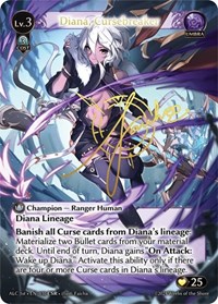 Banish all Curse cards from Diana's lineage: Materialize two Bullet cards from your material deck. Until end of turn, Diana gains "On Attack: Wake up Diana." Activate this ability only if there are four or more Curse cards in Diana's lineage.