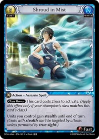 Description: [Class Bonus] This card costs 2 less to activate. (Apply this effect only if your champion's class matches this card's class.) Units you control gain stealth until end of turn. (Units with stealth can't be targeted by attacks unless permitted by true sight.)