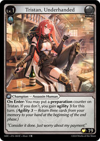Description: On Enter: You may put a preparation counter on Tristan. If you don’t, you gain agility 3 for this turn. (Agility 3 — Return three cards from your memory to your hand at the beginning of the end phase.)