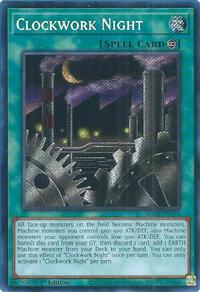 Description: All face-up monsters on the field become Machine monsters. Machine monsters you control gain 500 ATK/DEF, also Machine monsters your opponent controls lose 500 ATK/DEF. You can banish this card from your GY, then discard 1 card; add 1 EARTH Machine monster from your Deck to your hand. You can only use this effect of "Clockwork Night" once per turn. You can only activate 1 "Clockwork Night" per turn.