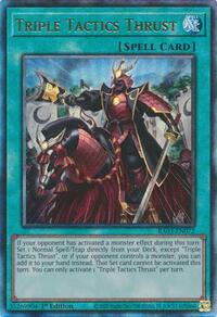 Description: If your opponent has activated a monster effect during this turn: Set 1 Normal Spell/Trap directly from your Deck, except "Triple Tactics Thrust", or if your opponent controls a monster, you can add it to your hand instead. That Set card cannot be activated this turn. You can only activate 1 "Triple Tactics Thrust" per turn.