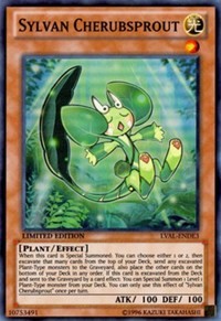 Description: When this card is Special Summoned: You can choose either 1 or 2, then excavate that many cards from the top of your Deck, send any excavated Plant-Type monsters to the Graveyard, also place the other cards on the bottom of your Deck in any order. If this card is excavated from the Deck and sent to the Graveyard by a card effect: You can Special Summon 1 Level 1 Plant-Type monster from your Deck. You can only use this effect of "Sylvan Cherubsprout" once per turn.