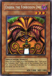 Description: When you have "Right Leg of the Forbidden One", "Left Leg of the Forbidden One", "Right Arm of the Forbidden One" and "Left Arm of the Forbidden One" in addition to this card in your hand, you win the Duel.