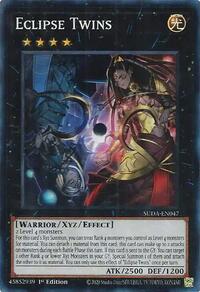 Description: 2 Level 4 monsters For this card's Xyz Summon, you can treat Rank 4 monsters you control as Level 4 monsters for material. You can detach 1 material from this card; this card can make up to 2 attacks on monsters during each Battle Phase this turn. If this card is sent to the GY: You can target 2 other Rank 4 or lower Xyz Monsters in your GY; Special Summon 1 of them and attach the other to it as material. You can only use this effect of "Eclipse Twins" once per turn.