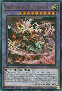 Description: 1 "Fiendsmith" Fusion Monster + 1 Fusion or Link Monster Unaffected by card effects, except "Fiendsmith" cards, while equipped with a "Fiendsmith" Equip Spell. You can only use each of the following effects of "Fiendsmith's Rextremende" once per turn. If this card is Fusion Summoned: You can discard 1 card; send 1 LIGHT Fiend monster from your Deck or Extra Deck to the GY. If this card is sent to the GY: You can target 1 other "Fiendsmith" card in your GY or banishment; add it to your hand.