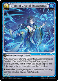 Description: As a Spell, whenever your Shifting Currents change from facing South to East while Taiji of Crystal Strategems is awake, you may rest it. If you do, deal 3 damage to target champion you don't control.