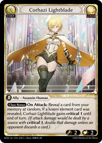 Description: [Class Bonus] On Attack: Reveal a card from your memory at random. If a luxem element card was revealed, Corhazi Lightblade gains critical 1 until end of turn. (If attack damage would be dealt by a source with critical 1, double that damage unless an opponent discards a card.)