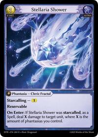 On Enter: If Stellaria Shower was starcalled, as a Spell, deal X damage to target unit, where X is the amount of phantasias you control.