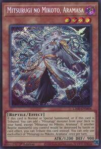 Description: If this card is Normal or Special Summoned, or if this card is Tributed: You can add 1 "Mitsurugi" monster from your Deck to your hand, except "Mitsurugi no Mikoto, Aramasa". If another Reptile monster(s) you control would be destroyed by battle or card effect, you can Tribute this card instead. You can only use each effect of "Mitsurugi no Mikoto, Aramasa" once per turn.