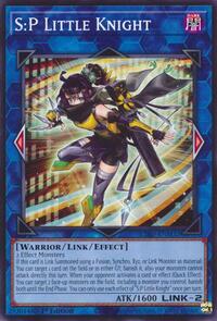 If this card is Link Summoned using a Fusion, Synchro, Xyz, or Link Monster as material: You can target 1 card on the field or in either GY; banish it, also your monsters cannot attack directly this turn. When your opponent activates a card or effect (Quick Effect): You can target 2 face-up monsters on the field, including a monster you control; banish both until the End Phase. You can only use each effect of "S:P Little Knight" once per turn.