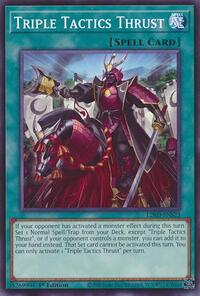 Description: If your opponent has activated a monster effect during this turn: Set 1 Normal Spell/Trap directly from your Deck, except "Triple Tactics Thrust", or if your opponent controls a monster, you can add it to your hand instead. That Set card cannot be activated this turn. You can only activate 1 "Triple Tactics Thrust" per turn.