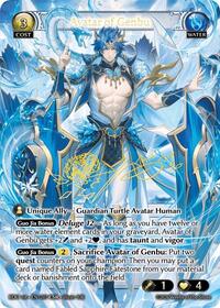 Description: [Guo Jia Bonus] Deluge 12 — As long as you have twelve or more water element cards in your graveyard, Avatar of Genbu gets +2POWER and +2LIFE, and has taunt and vigor.