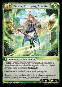 If one or more cards would enter a player's graveyard while Sasha is fostered, banish them instead.