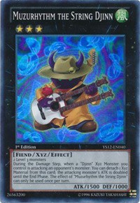 Description: 2 Level 3 monsters // During the Damage Step, when a "Djinn" Xyz Monster you control is attacking an opponent's monster: You can detach 1 Xyz Material from this card; the attacking monster's ATK is doubled until the End Phase. The effect of "Muzurhythm the String Djinn" can only be used once per turn.