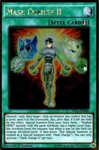 Description: Discard 1 card, then target 1 face-up monster you control that has a Level; send it to the Graveyard, also, after that, if it left the field by this effect, Special Summon from your Extra Deck, 1 "Masked HERO" monster with the same Attribute, but a higher Level than, the Attribute/Level the monster had when it was on the field (its original Attribute/Level, if face-down. This Special Summon is treated as a Special Summon with "Mask Change"). You can only activate 1 "Mask Change II" per turn.